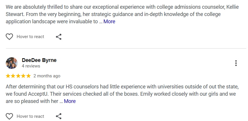 On Google, AcceptU has plenty of glowing reviews, often praising specific counselors for their energy and guidance.