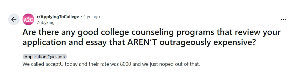 AcceptU’s pricing isn’t displayed on its website, but according to previous clients, packages often cost several thousand dollars, with some families quoted around $8,000 even for standard counseling options.
