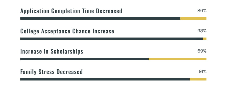 On their homepage, they advertise results like Application Completion Time Decreased 86% and College Acceptance Chance Increase 98%. However, there’s no explanation of how those numbers were calculated or verified.