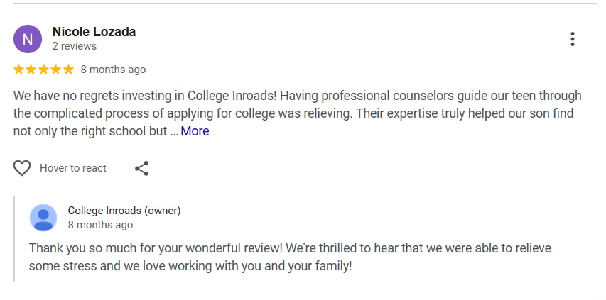 Worse, CollegeInroads.com doesn’t offer any guarantees. I understand that no one can guarantee admission to a top school, but at the very least, families deserve some form of reassurance that their investment will yield real results.