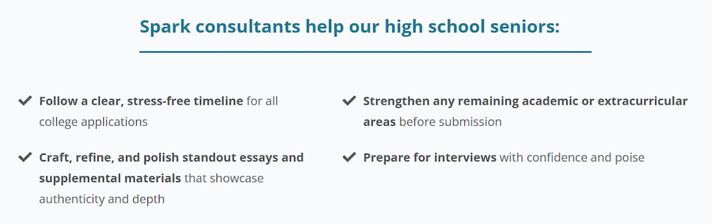 As you can see, SparkAdmissions offers a full suite of college consulting services. They claim to provide “one-on-one, personalized” support to increase students’ chances of getting into elite schools like Ivy League institutions.