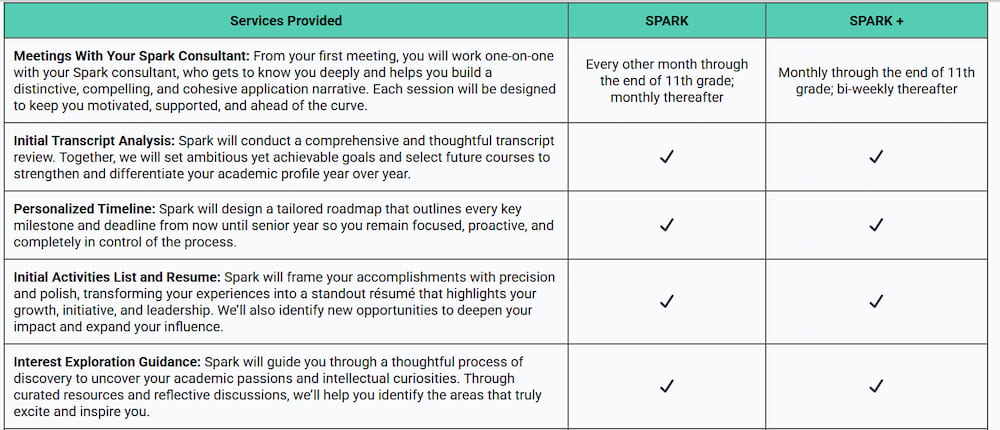 In addition, they promote Spark+ for those wanting more attention. This tier adds extra meetings, more essay rounds, help with summer program applications, and tutoring hours.